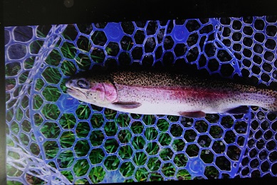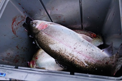 ここの魚は大きいことで有名なんですが、このニジマスはその中でも大物の、三倍体のドナルドソンです、赤身で脂が乗っていて最高です。あとこの時期はメスが子持ちなのでイクラ(マスコ)が取れます、これも最高においしいんです。