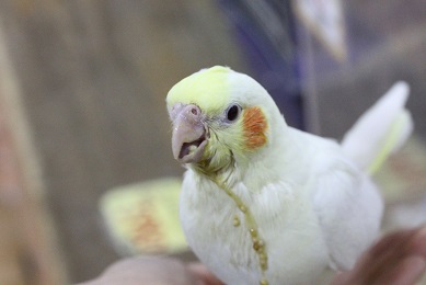 お食事中の白オカメインコさんです、ちょっとこぼれちゃってますが(笑)