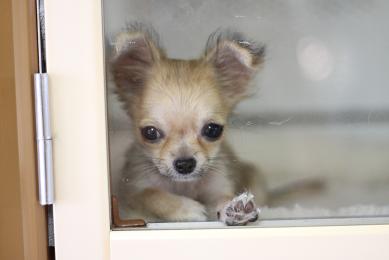 シュタツ!!と手をあげているのはチワワのフォーンホワイトカラーの女の子です。