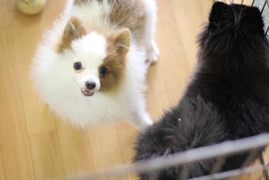 こちらをキラキラした瞳でみているのはポメラニアンのパーティーカラーの男の子です。
