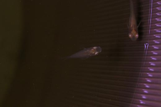 画像暗くてすみません、よく見ると目が赤いんです、アルビノメダカという種類です。