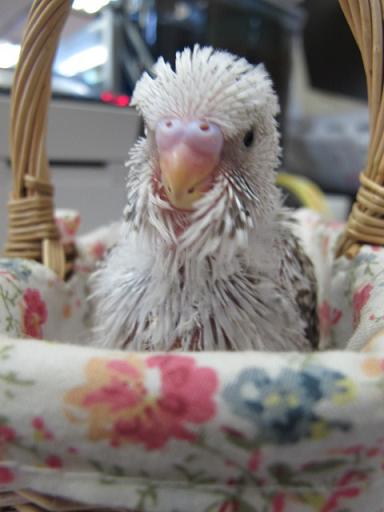 見てくださいこのパッチリお目目!!ヒナエサを卒業したばっかりのウロコメキシコインコのシナモンカラーです。