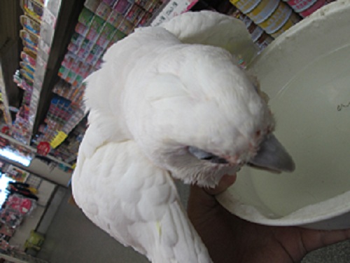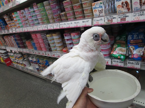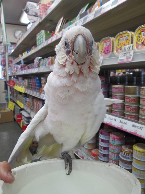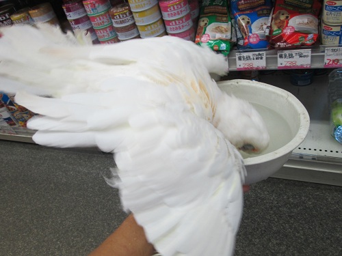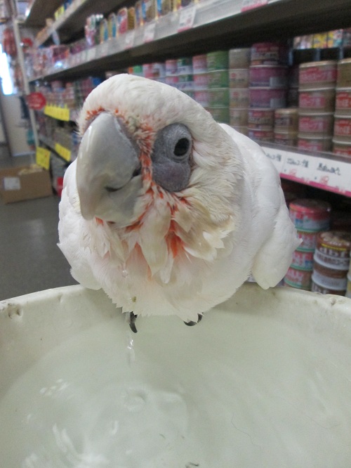 鳥 小動物コーナーのアイドルアカビタイムジオウムはっちゃんと水かけごっこをして、