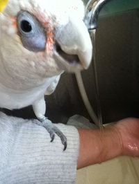 アカビタイムジオウムのはっちゃん、水浴びさせています。はっちゃん、すんなり楽しんでくれてました。ことばのレパートリーも増えてきた!?