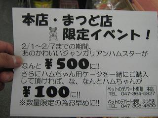 本店とまつど店のみの限定イベントで2/1~2/7まで可愛いジャンガリアンがなんと¥500で飼えると