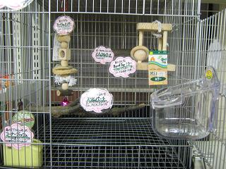 おもちゃだけでなくちょっと面白い止まり木なんかいれてみたのですが、実はスタッフ(ジュン)