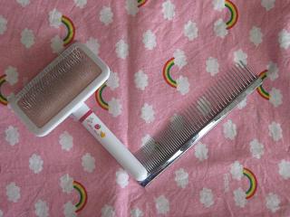 ワンちゃん用のスリッカー(ブラシ)とコーム(櫛)を用意して、
