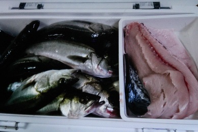 左側の大量の魚はセイゴです、(スズキの幼魚)捌くのに1時間かかりました、25匹ぐらいいました、超大量です!!
